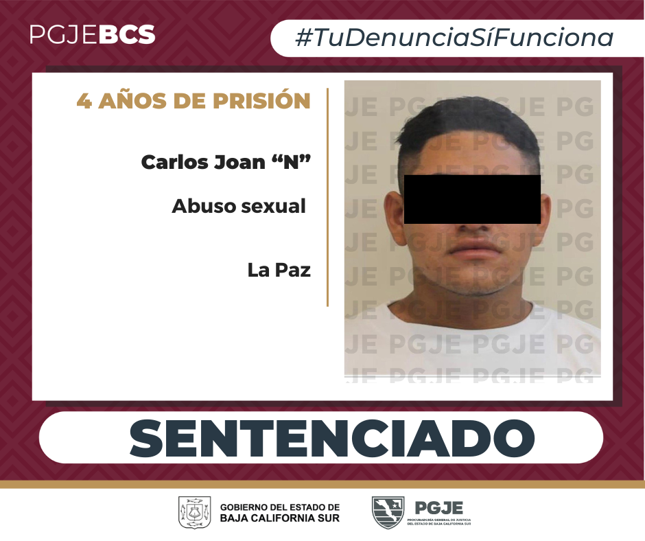 Ante la presentación de elementos de prueba suficientes y necesarios la Procuraduría General de Justicia del Estado (PGJE) de Baja California Sur acreditó la responsabilidad de Carlos Joan “N” en el delito de abuso sexual agravado, ocurrido en La Paz el 31 de diciembre del 2019.