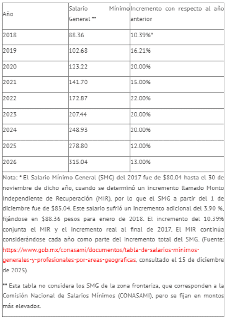 Es importante hacer notar que, si se consulta la tabla oficial de salarios mínimos generales y profesionales y se comparan los salarios de 2025 y 2026, el incremento es igual al propuesto para el SMG, pero entonces, ¿qué determina esa diferencia entre salarios mínimos generales y profesionales?
