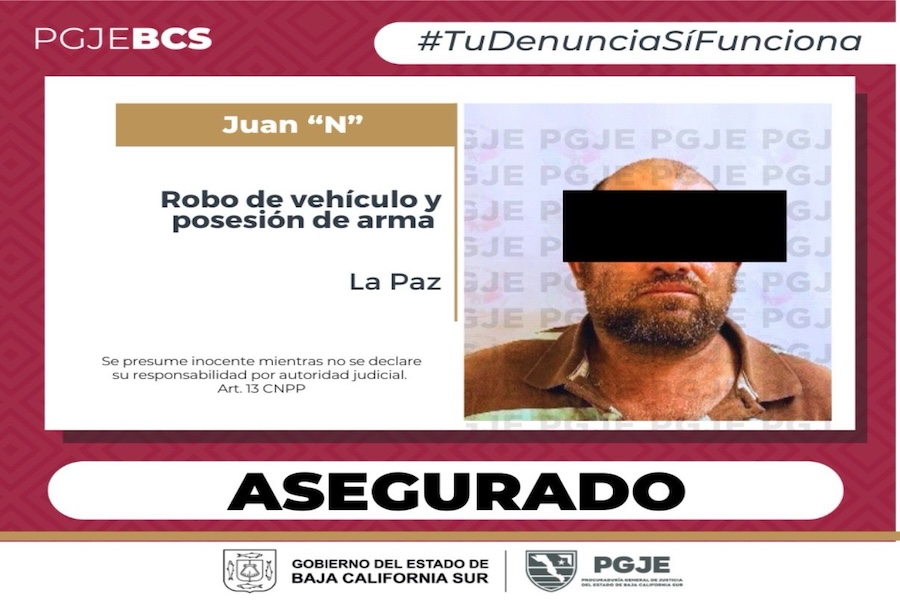 Como resultado de las estrategias de seguridad y atención a denuncias ciudadanas, la Procuraduría General de Justicia del Estado (PGJE) de Baja California Sur, a través de la Subprocuraduría de Atención a Delitos de Alto Impacto, informa la detención de un masculino y el aseguramiento de un arma de fuego, cartuchos útiles y cinco vehículos, con reporte de robo.