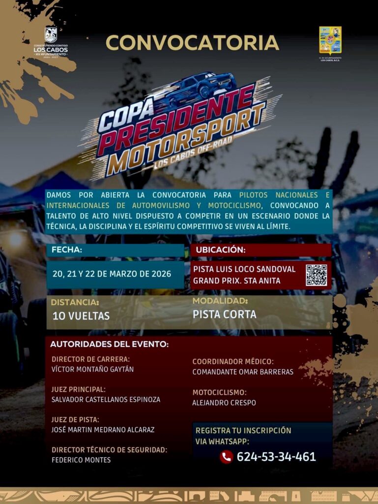 Los Cabos, Baja California Sur.– Con la participación de alrededor de 330 equipos de automovilismo y motociclismo Off Road, del 20 al 22 de marzo se realizará la carrera “Copa Presidente Motorsport 2026”, evento que forma parte de las actividades deportivas de las Fiestas Tradicionales de San José del Cabo.