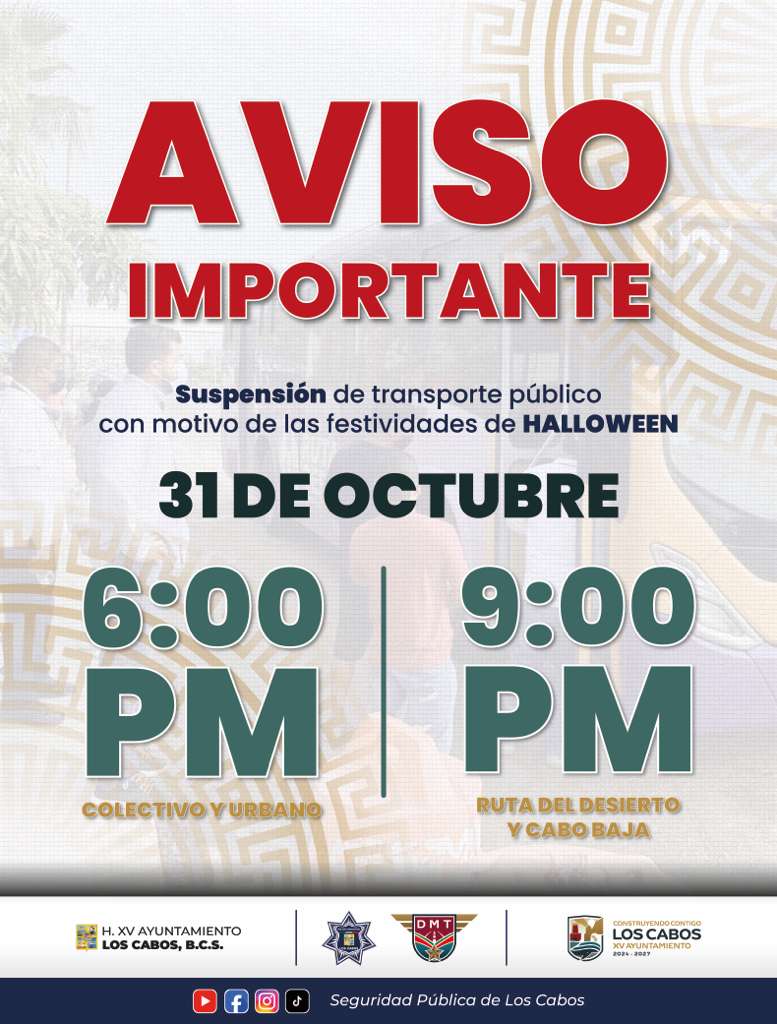 Los Cabos, Baja California Sur.- Con el objetivo de garantizar la seguridad de la ciudadanía durante las celebraciones de Halloween, el XV Ayuntamiento de Los Cabos, a través de la Dirección Municipal de Transporte a cargo de Flavio Amador Hernández, informa que este 31 de octubre se aplicarán ajustes temporales en los horarios de operación del transporte público urbano y colectivo, los cuales brindarán servicio hasta las 18:00 horas.