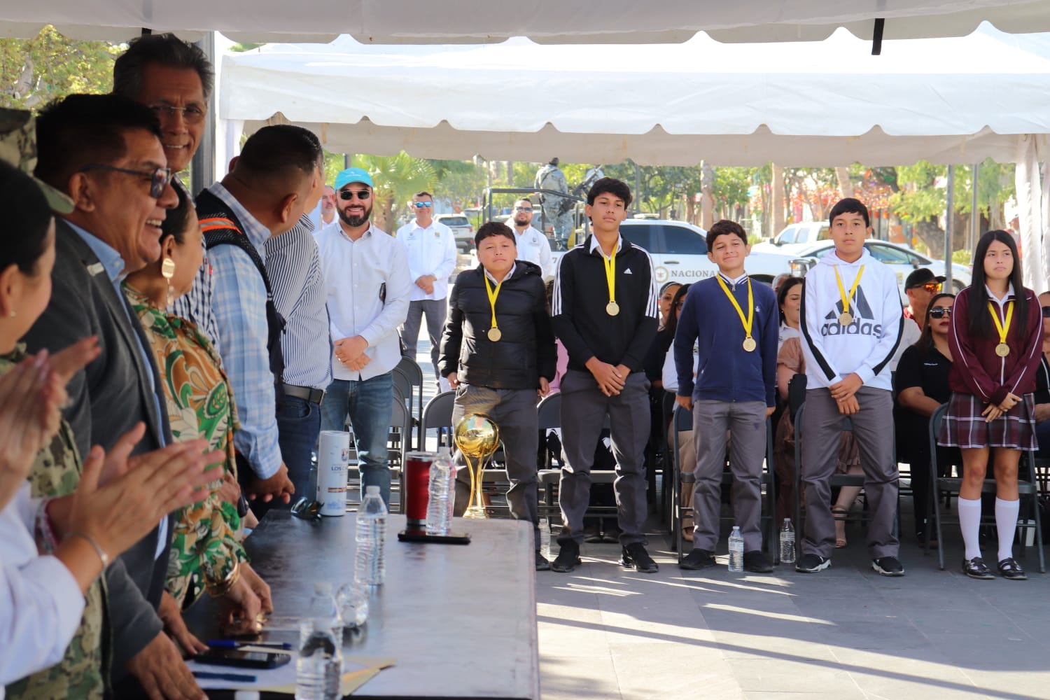 San José del Cabo.- Durante la ceremonia de honores de este lunes, se reconoció el gran logro obtenido por Zofemat Los Cabos y la Secundaria Técnica No. 25, quienes se coronaron campeones de la primera edición de la Copa Pazífica, un evento que promueve la sana convivencia y la cultura de paz entre la juventud cabeña.