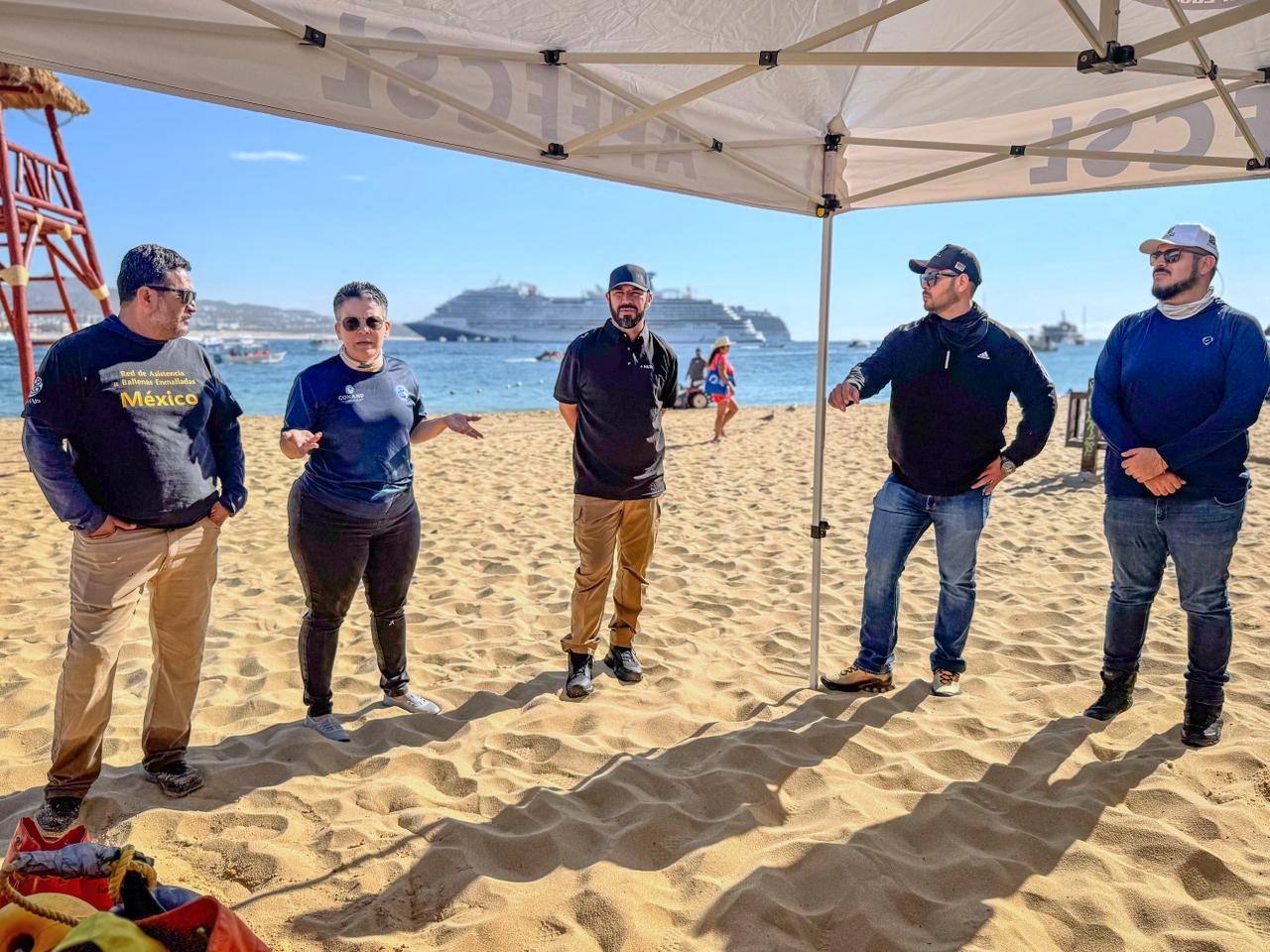 Los Cabos, Baja California Sur.– Personal de la Zona Federal Marítimo Terrestre (Zofemat) Los Cabos participó en un ejercicio práctico del Protocolo de Atención a Ballenas Enmalladas realizado en playa El Corsario, con el objetivo de fortalecer la capacidad de respuesta ante posibles contingencias con fauna marina.